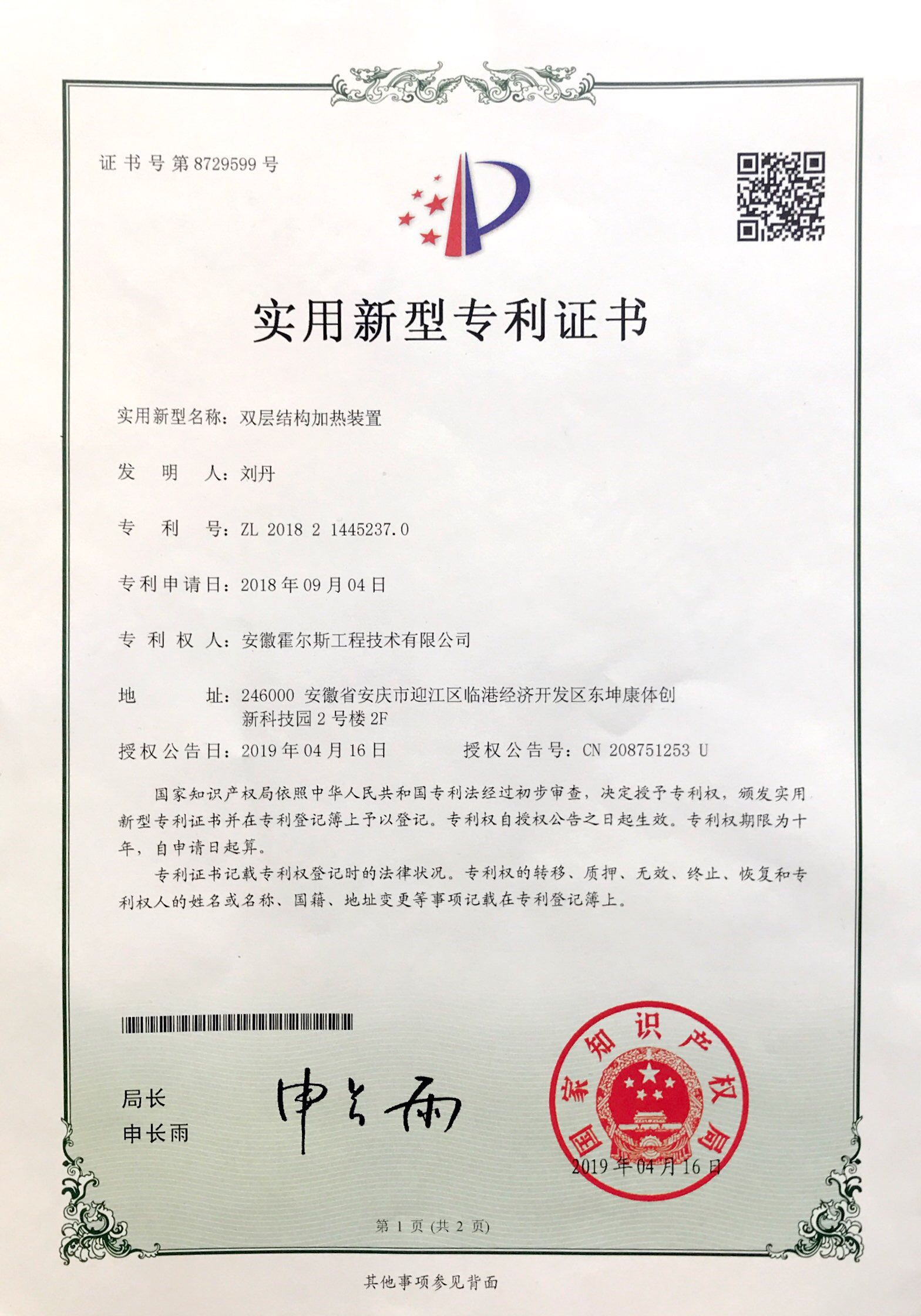 双层结构加热设计增加了空气在加热器中通过的时间,使得发热管热量更好传递给空气,保证了对空气温度的要求,发热管在发热过程中,热能有效的被加热外管和加热內管吸收,在空气通过时,提高了热接触面积,提高了热转化效率,同时有提高了能效利用率。近期,该项设计已成功获得国家专利证书,这是草莓视频免费看下载公司坚持自主研发的又一新的成果。