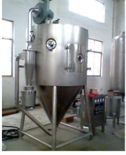 喷雾干燥是系统化技术应用于物料干燥的一种方法。于干燥室中将稀料经雾化后,在与热空气的接触中,水分迅速汽化,即得到干燥产品。该法能直接使溶液、乳浊液干燥成粉状或颗粒状制品,可省去蒸发、粉碎等工序。